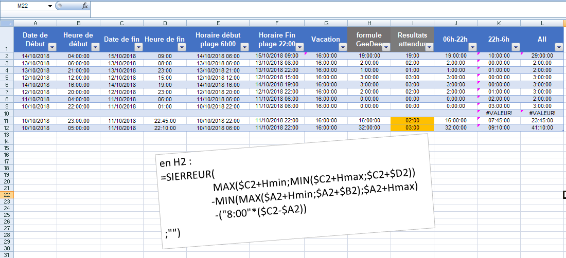 J'ai donc mis une formule en place, seulement si la date de début n'égale pas la date de fin la formule atteint sa limite, je m'explique : si l'intervention débute à 22h pour finir à 1h le lendemain la formule comptabilise les heures malgré qu'elles soient hors plage horaire.