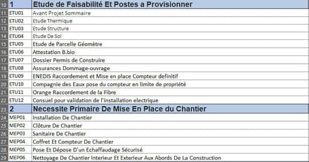 La question : je veux pouvoir mettre une condition qui fait que : quand je supprimer un poste de travaux, cela supprime automatiquement toutes les lignes qui lui sont liés ; Dans l'exemple ci-joint, en supprimant uniquement la ligne 'Etude de faisabilité' cela supprimera toutes les autres jusqu'au prochain poste, ligne 23.