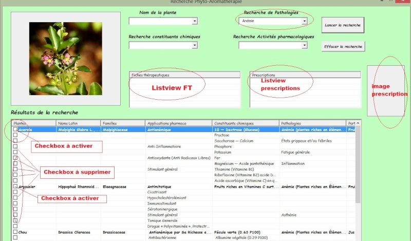 Pour info, la listview "Prescriptions" marchera avec le même principe, en sachant qu'ici, les prescriptions sont stockées dans le même dossier que le reste, mais dans un dossier "prescriptions" tout comme les photos des plantes au même format ".jpg". Idem que précédemment, cette recherche s'effectura en fonction du combobox "Pathologies". Les résultats seront visible dans la listview "Prescriptions" avec possibilité de sélectionner avec un click la photo associé (dossier prescriptions) et un checkbox pour chaque résultats trouvés pour choisir une impression ou pas. ( A l'avenir, à côté de cette listview, une imagebox est présente, j'essaierai de mettre une loupe juste en passant sur celle-ci).
